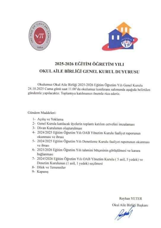 2025-2026 Eğitim Öğretim Yılı Olağan Seçimli Genel Kurulumuz belirlenen tarihte yapılacaktır. Tüm velilerimizi aramızda görmekten mutluluk duyarız.