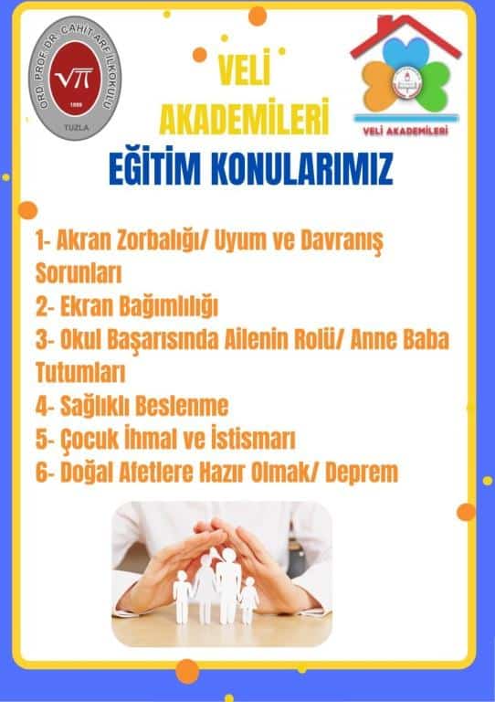 2025-2026 Eğitim Öğretim Yılında okulumuzda yürütülecek olan 'Veli Akademileri Projesi' kapsamında bir birinden önemli konuları birbirinden değerli eğitmenlerimizden dinleyeceğiz. Çocuklarımızın gelişimine her alanda katkı sunmak adına eğitimlerimize tüm velilerimiz davetlidir. Her ay yapılacak olan eğitimin en az bir hafta öncesinden günü ve saati duyurulacaktır.